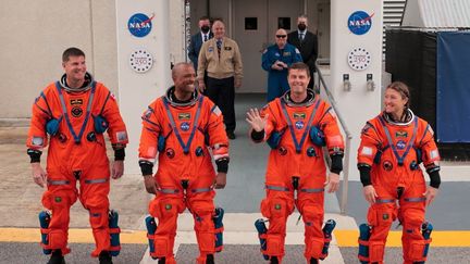 Les quatre astronautes de la mission Artemis II avec (de gauche à droite) le Canadien Jeremy Hansen et les Américains Victor Glover,Reid Wiseman et Christina Koch,avant leur décollage,le 1er avril 2026 à Cap Canaveral (Etats-Unis). (CHIP SOMODEVILLA / GETTY IMAGES NORTH AMERICA )