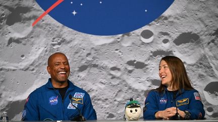 Les astronautes de la mission Artemis II de la NASA,Victor Glover (à gauche) et Christina Koch,lors d'une conférence de presse au Centre spatial Johnson de Houston,au Texas,le 16 avril 2026. (RONALDO SCHEMIDT )