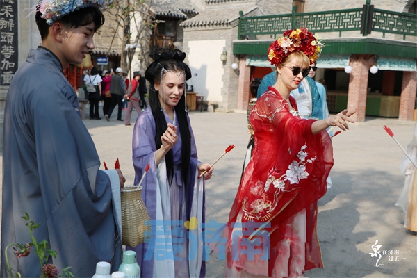 The international friends, dressed as ancient deities, toured the Mingshui Ancient Town and participated in park activities, experiencing traditional customs associated with the approaching spring festival at close quarters. Each checkpoint in the park activities was carefully designed to offer different interactive experiences inspired by the ancient "Six Arts and Eight Elegant Arts," allowing foreign friends to enjoy the profound cultural heritage of Li Qingzhao's birthplace while indulging in leisurely park activities.