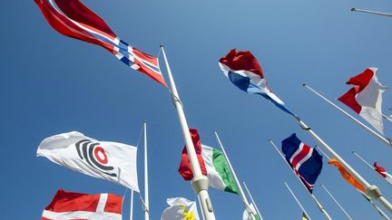 Des drapeaux de tous les pays flottent devant l'Office européen des brevets à Rijswijk,aux Pays-Bas. (BART MAAT / ANP)